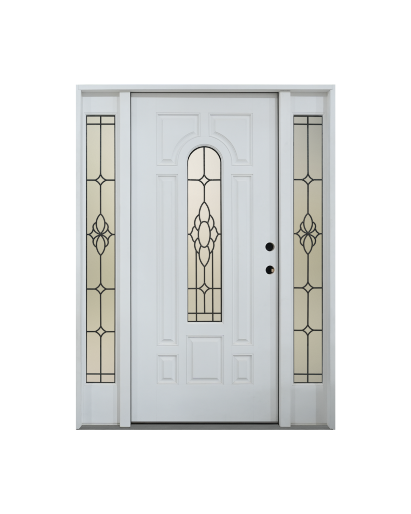 The Bullet Smooth Fiberglass Entry Door with matching sidelites offers a perfect balance of style, durability, and elegance. Designed with a leaded glass center panel and coordinating full-lite sidelites, this door brings in natural light while maintaining privacy. Built from smooth fiberglass, it provides long-lasting performance with minimal maintenance.